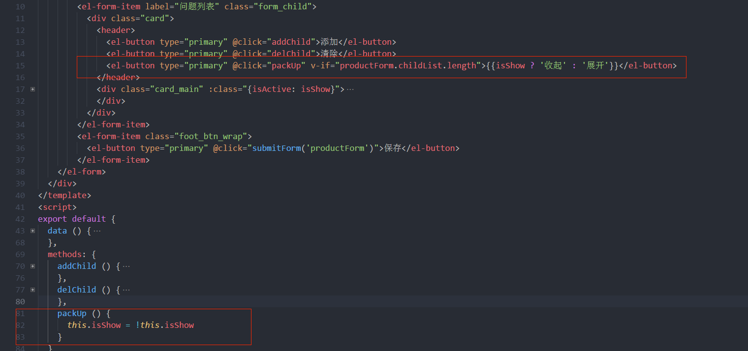 - 点击收起按钮,表单收起,文案变成展开;点击展开,表单展开,文案变成收起;通过isShow参数来控制问题表单的height实现收起与展开的效果。