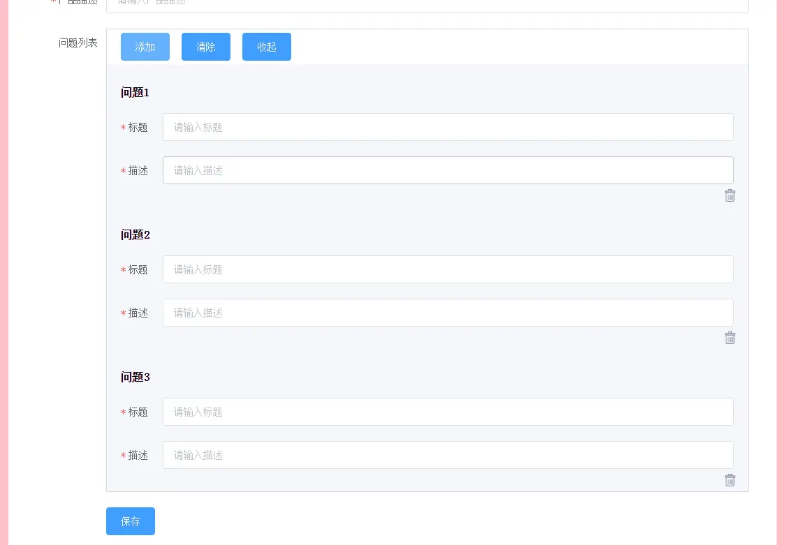 - 每个表单都有一个删除按钮,点击删除,删除对应的问题表单,问题1、问题2、等重新排序。当删除所有问题表单之后,收起按钮消失;