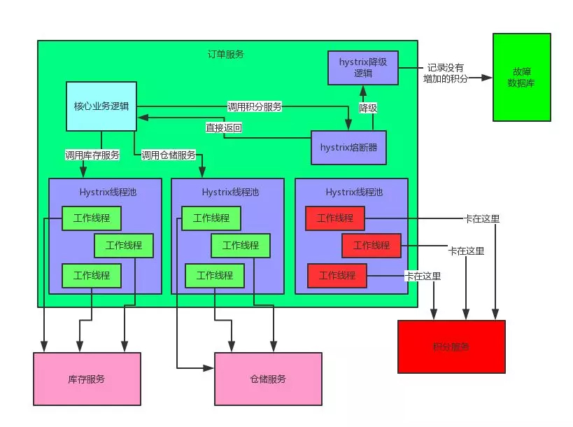 当然会导致订单服务里的那个用来调用积分服务的线程都卡死不能工作了啊!但是由于订单服务调用库存服务、仓储服务的这两个线程池都是正常工作的,所以这两个服务不会受到任何影响。