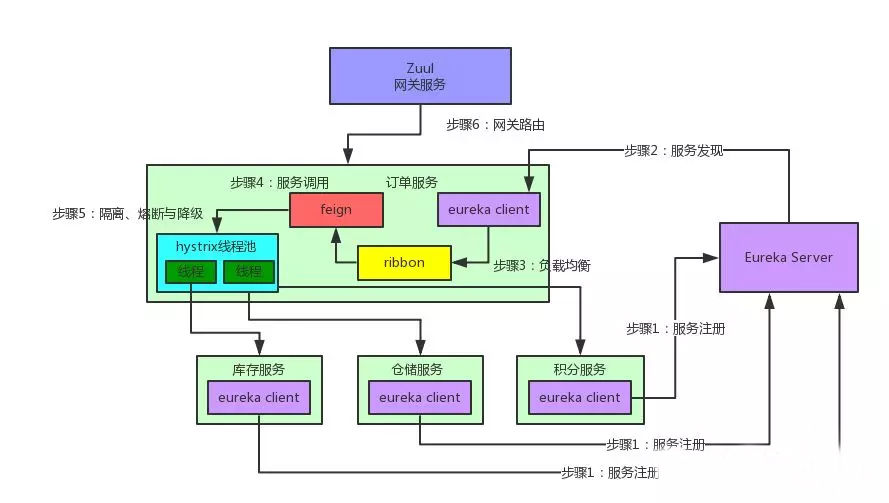 此外,Ribbon是和Feign以及Eureka紧密协作,完成工作的,具体如下: