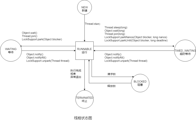 - thread.join()/thread.join(long millis),当前线程里调用其它线程thread的join方法,当前线程进入WAITING/TIMED_WAITING状态,当前线程不会释放已经持有的对象锁。线程thread执行完毕或者millis时间到,当前线程进入就绪状态。