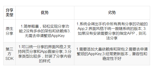 最后呢,总结一下利用Android原生实现分享和利用第三方SDK实现的优缺点,如下表中所示: