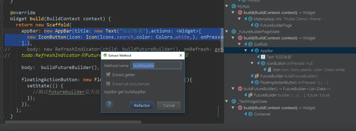 Extract method的作用是:可以把某一个widget控件的代码,帮你封装成一个方法。不用你去手动地去找出一个widget的全部代码,再自己拉到某一个方法内。