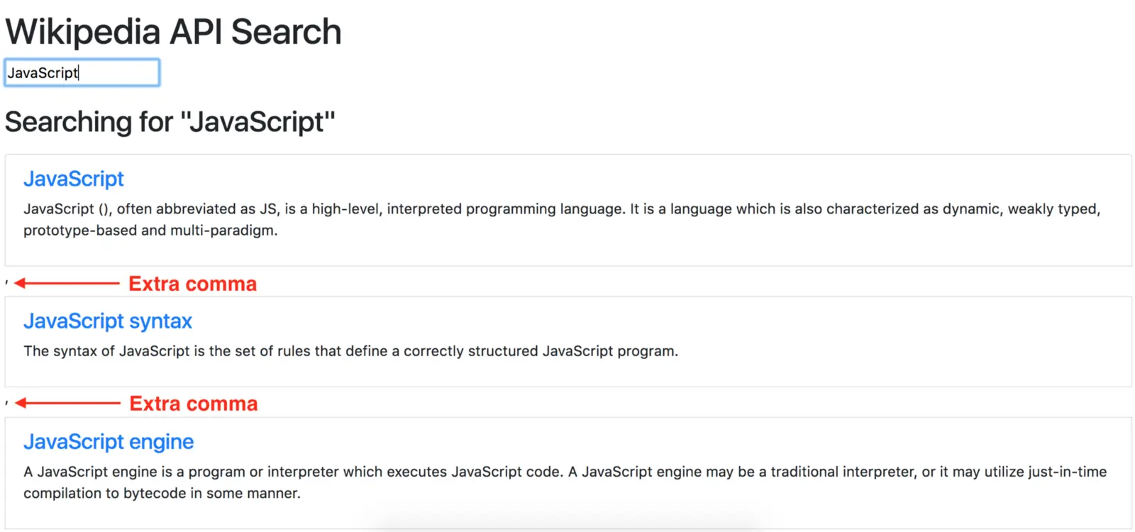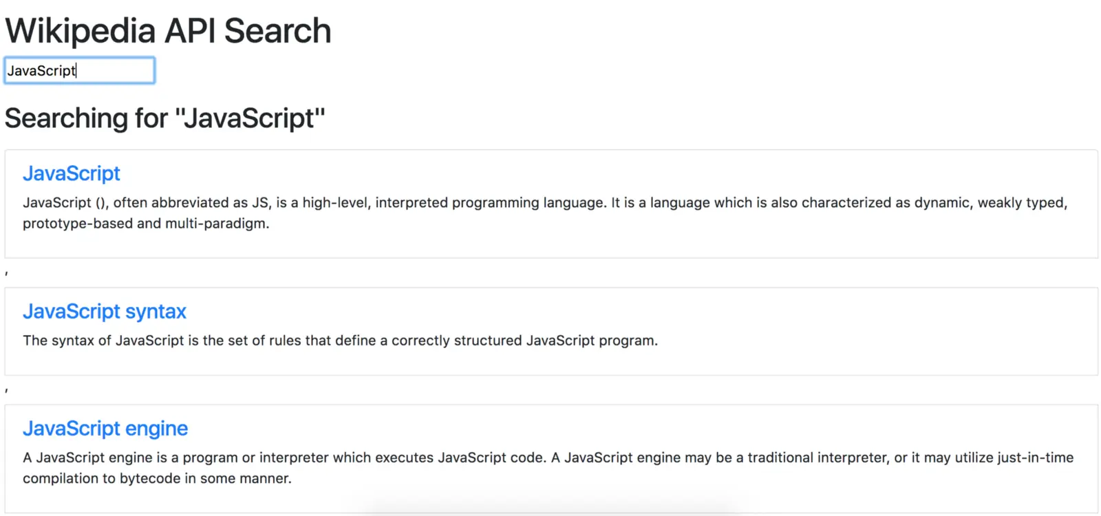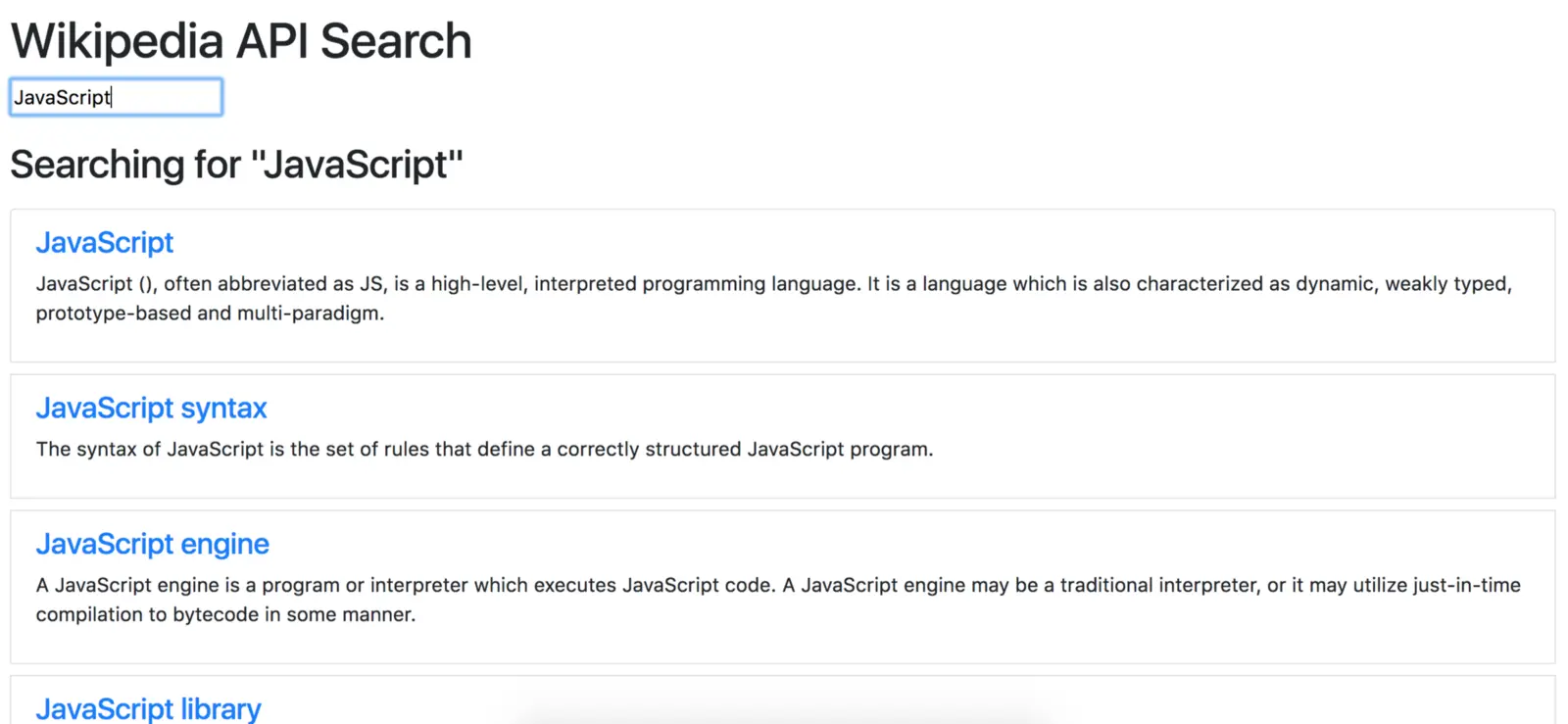 export default ([query, names, summaries, links]) => ` <h2>Searching for "${query}"</h2> <ul class="list-group"> ${names .map( (name, index) => ` <li class="list-group-item"> <a href=${links[index]} target="_blank"> <h4>${name}</h4> </a> <p>${summaries[index]}</p> </li> ` ) .join('')} </ul>`;Now your UI’s much cleaner.