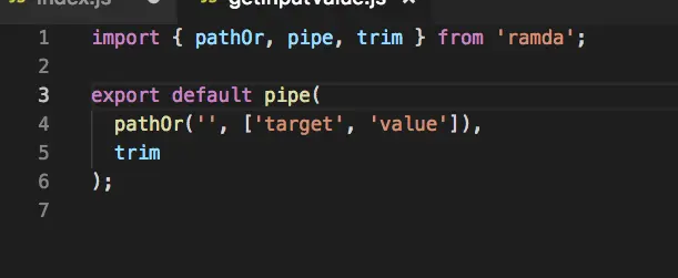 import { pathOr, pipe, trim } from 'ramda';const getInputValue pipe( pathOr('', ['target', 'value']), trim);We now have a composed function that takes an event object, grabs its target.value, defaults to '', and trims it.