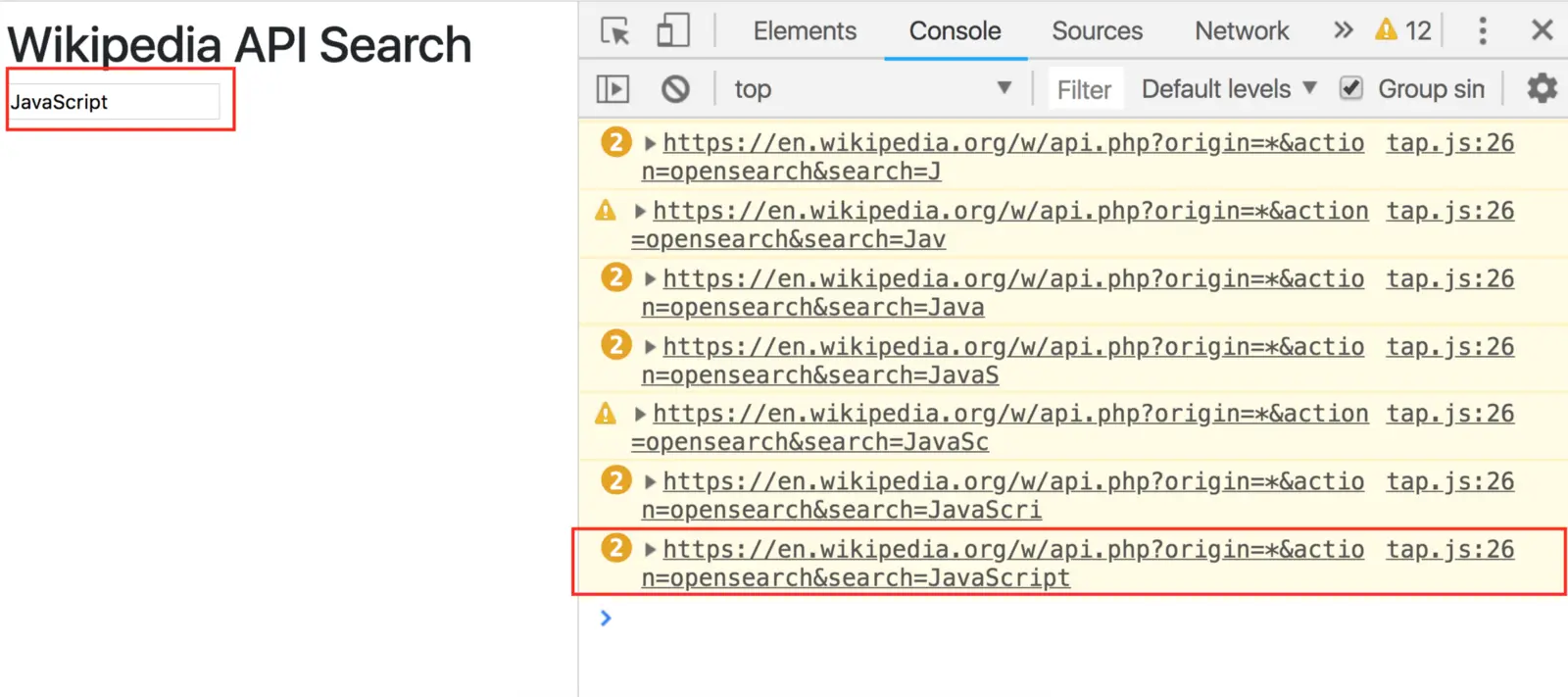 import 'bootstrap/dist/css/bootstrap.min.css';import { pipe, tap } from 'ramda';import getInputValue from './getInputValue';import getUrl from './getUrl';const makeUrlFromInput = pipe( getInputValue, getUrl, tap(console.warn));const inputElement = document.querySelector('input');inputElement.addEventListener('keyup', makeUrlFromInput);This new code’s constructing our request URL from the user’s input and logging it via tap.