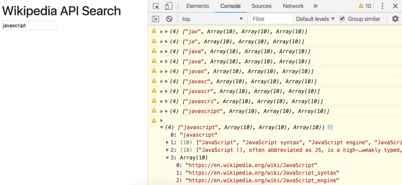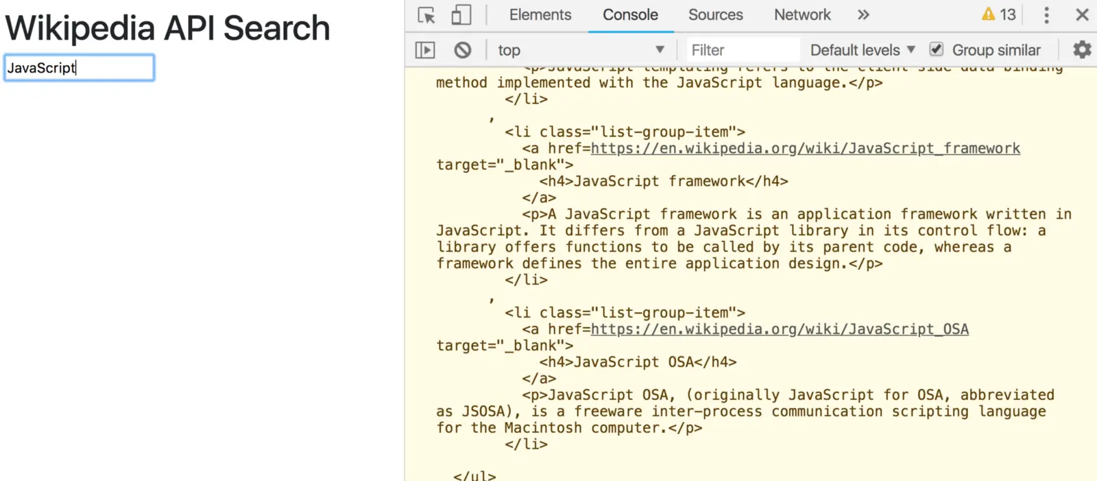 ...import Results from './Results';...const searchAndRenderResults = pipe( getInputValue, getUrl, url => fetch(url) .then(res => res.json()) .then(Results) .then(console.warn));This passes the Wikipedia JSON to Results and logs the result. You should be seeing a bunch of HTML in your DevTools console!