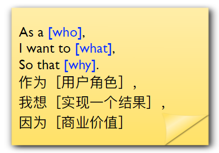 User Story:即用户故事,是使用简单的书面描述,定义一小片用户可以评估、验证的功能。