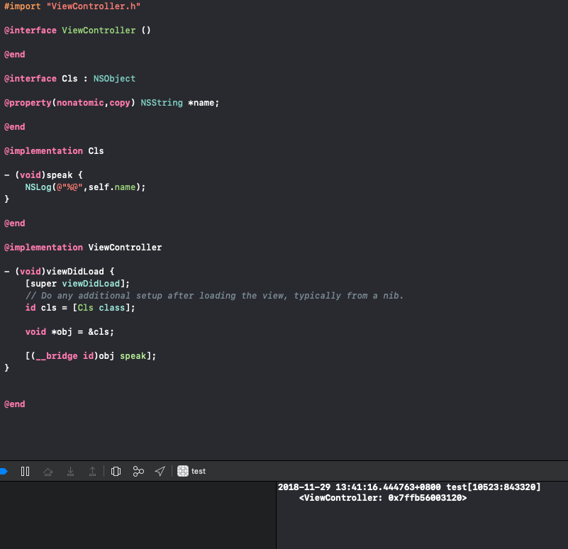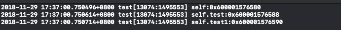 2018-11-29 21:03:30.490989+0800 test[2129:122769] cls address:0x7ffeebf4fa00 str address:0x7ffeebf4fa08