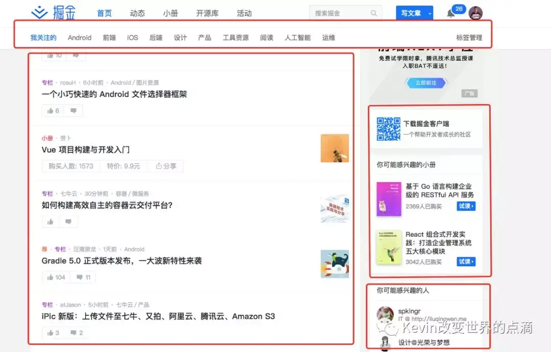 上图是掘金的社区动态。通过移动端的沸点内容与社区打通。有效的增加了社区UGC,与趣味性。