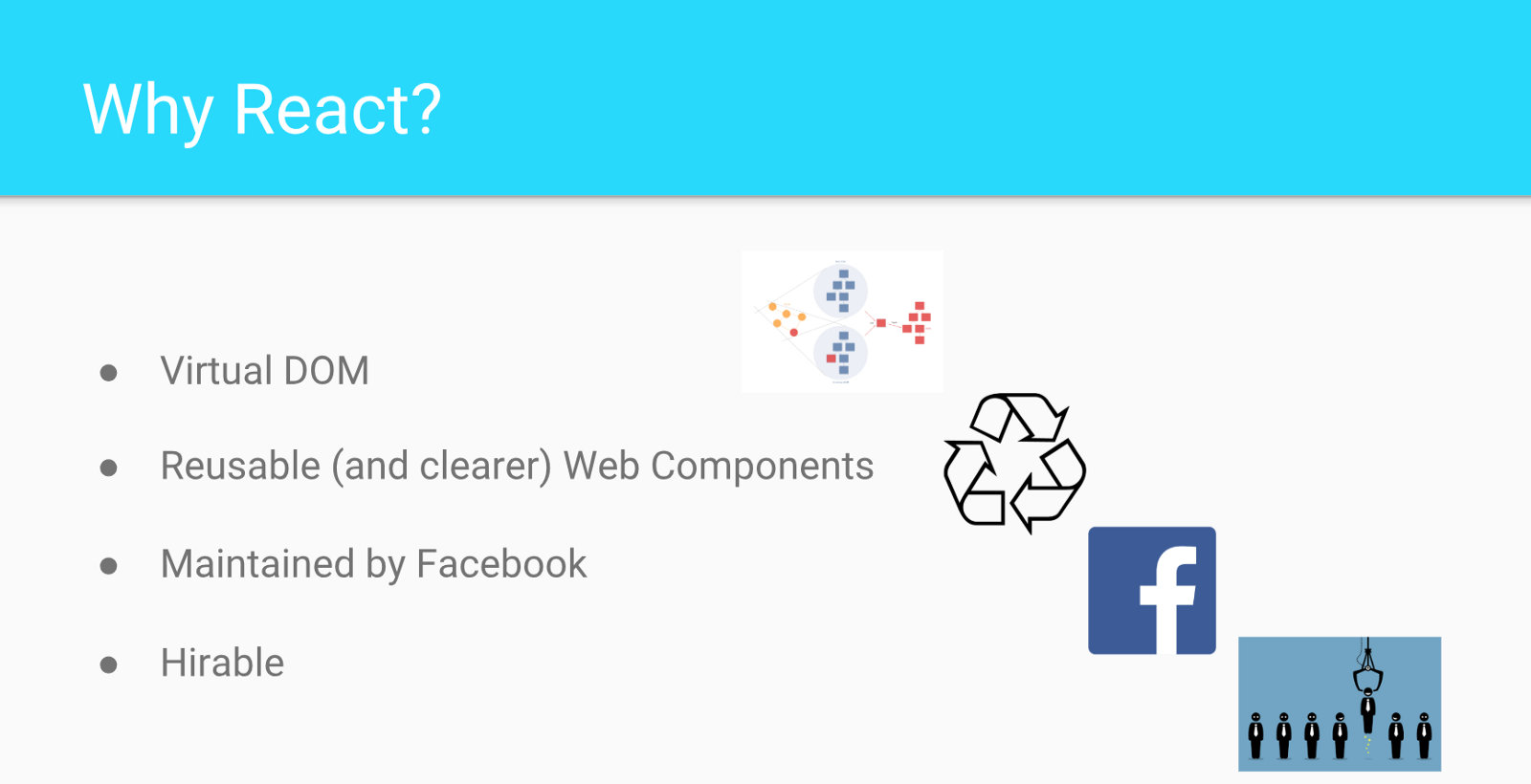 First things first, Bob lets us know why we should even consider using something like React instead of just writing it in plain JavaScript and why so many developers already chose to use React.