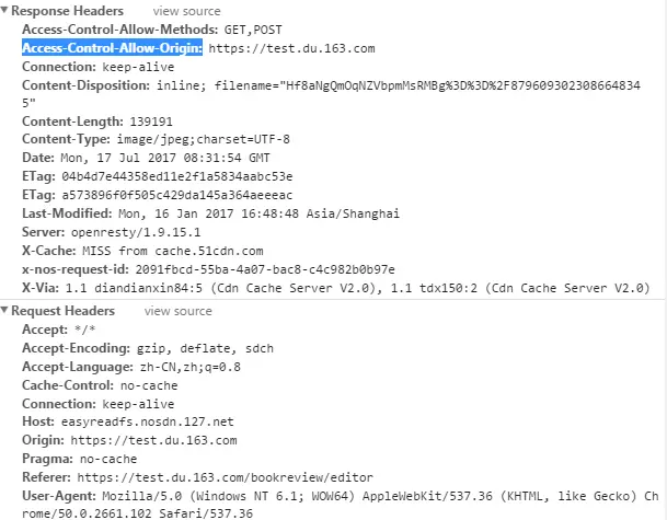要想解决这个办法,就涉及到一个前端的IMG标签的属性:crossOrigin,如果将这个属性设置为anonymous,浏览器就会为这张图片的请求的Request Headers 中附带Origin为当前域名的这一行信息,告诉图片所在的静态资源服务器,这张图片我需要跨域访问以及我的域名,请在图片的Response Headers中附加Access-Control-Allow-Methods和Access-Control-Allow-Origin这两行信息,如下图: