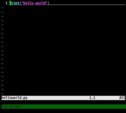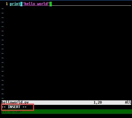 vim helloworld.py # vim + 你想编辑的文件夹路径如图1,vim打开helloworld.py文件就是这个界面,这时你想直接打字是没反应的,必须先按下键盘上的“i”键,进入编辑模式,如图2: