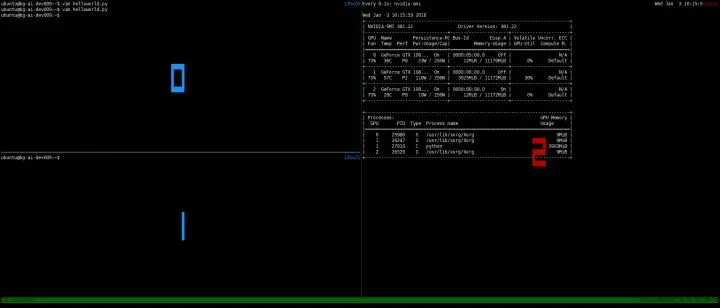 tmux可以允许在同一个会话窗口当中显示多个子窗口,方便在同一个屏幕内进行多个任务处理,如上图所示,新建了3个子窗口,可以同时进行多个任务。