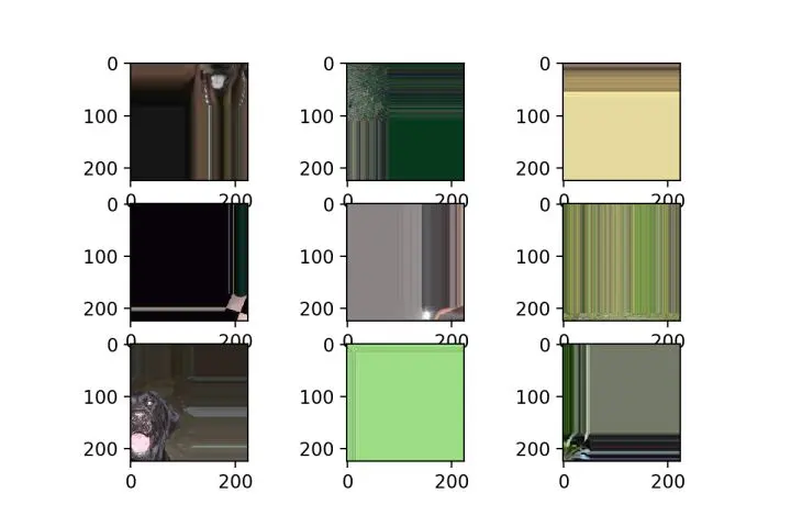 当设置为“constant”时,还有一个可选参数,cval,代表使用某个固定数值的颜色来进行填充。图19为cval=100时的效果,可以与图18右下角的无cval参数的图对比。