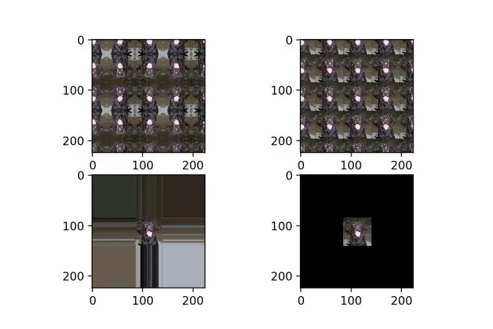 datagen = image.ImageDataGenerator(fill_mode='wrap', zoom_range=[4, 4])fill_mode为填充模式,如前面提到,当对图片进行平移、放缩、错切等操作时,图片中会出现一些缺失的地方,那这些缺失的地方该用什么方式补全呢?就由fill_mode中的参数确定,包括:“constant”、“nearest”(默认)、“reflect”和“wrap”。这四种填充方式的效果对比如图18所示,从左到右,从上到下分别为:“reflect”、“wrap”、“nearest”、“constant”。