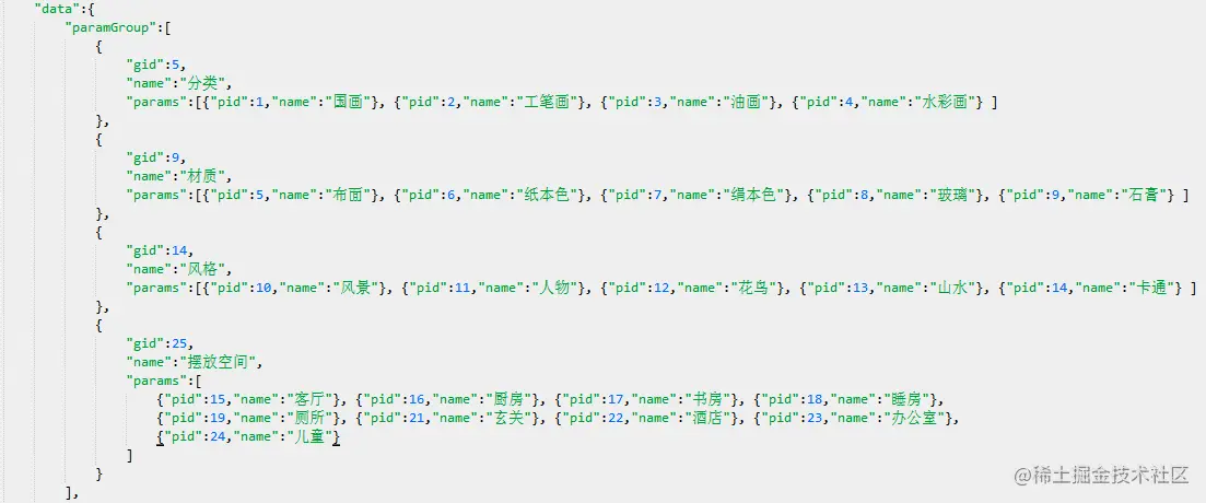 如图所示,和上面的筛选组件截图对应,4个参数组,每个参数组不同的id,所有参数项的id也不同,即便name相同也没有关系。