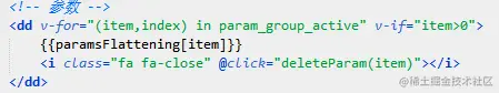 从上面的截图中可以看到点击了i 标签(是一个x图标)调用了deleteParam,并带进了参数item, 是参数项的id