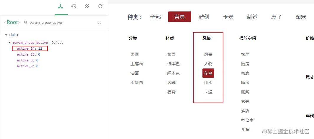 比如当我选择风格中的花鸟之后,风格的唯一id是14,而花鸟是12