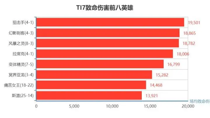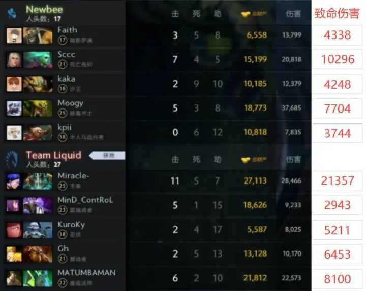有了致命伤害这个新指标之后,我们再回头看TI7的最后一场比赛。队伍层面,获胜方Liquid比NB高出1万4千点致命伤害(毕竟赢了嘛,人头也多10个);英雄层面,2W致命伤害的剑圣和1W致命伤害的DP是两个队伍的中流砥柱,有没有更符合大家看比赛时的直观感受?