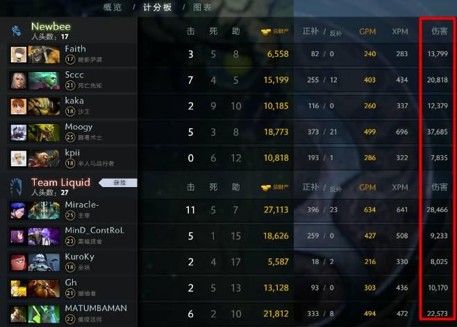 目前的「伤害」指标,是游戏结束后官方给出的英雄伤害数据,这个数值表示英雄在整场比赛中对敌方英雄造成的伤害总和。部分玩家喜欢用它来评判选手的表现,TI7最后一场比赛刚结束,就有玩家截取了上图,以人马伤害全场最低为由,将kpii批判一番。