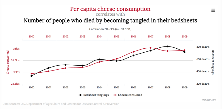 2、被床单缠死的人数和人均奶酪消耗量,高度相关。