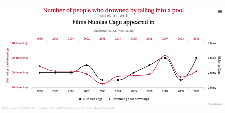 1、尼古拉斯凯奇在电影中的出镜和淹死在游泳池里的人数,高度相关。