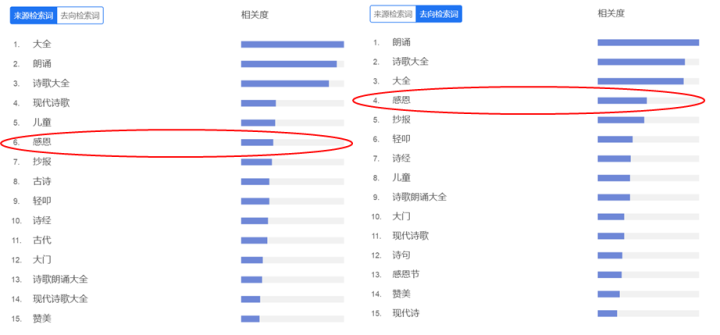 从搜索来源词以及搜索去向词来看,“感恩”的相关度也非常高,而这在其他时间段是没有的现象。即不少人在搜索“感恩”后去搜索“诗歌”,也有不少人在搜索“诗歌”后去搜索“感恩”。