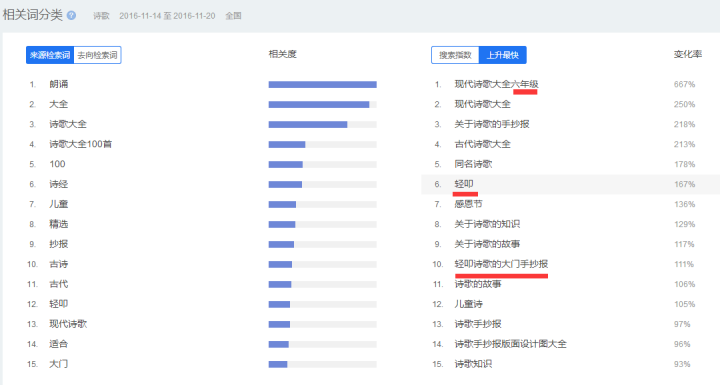 同时从“感恩”系列词汇(包括:感恩、感恩节以及感恩父母等)的搜索量级以及增长速度来看,量级超过70万,足以影响“诗歌”而拉出10万左右的峰值。同时“感恩”系列词汇的上涨速度在这个时间段的增幅排名靠前,基本都是翻倍以上的增长,足见这是该时间段独有的现象。