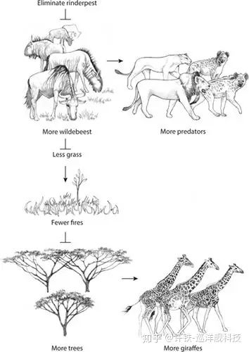 生物间的联系,往往会带来些意想不到的影响,比如在家养的牛中打疫苗,消灭了某种病毒,导致了野生的牛羊变多了,这会导致更多的捕食者,但也会导致草原上的草变得更稀疏,从而起火的概率降低,而这又会是树苗更多的存活,从而带来更多的树木,而这又养活更多的长颈鹿。不止关注一件事情的一阶影响,而要根据食物链上相互调节的网络,去细推所有的可能后果,这是生态学能够教给我们的第二个道理。