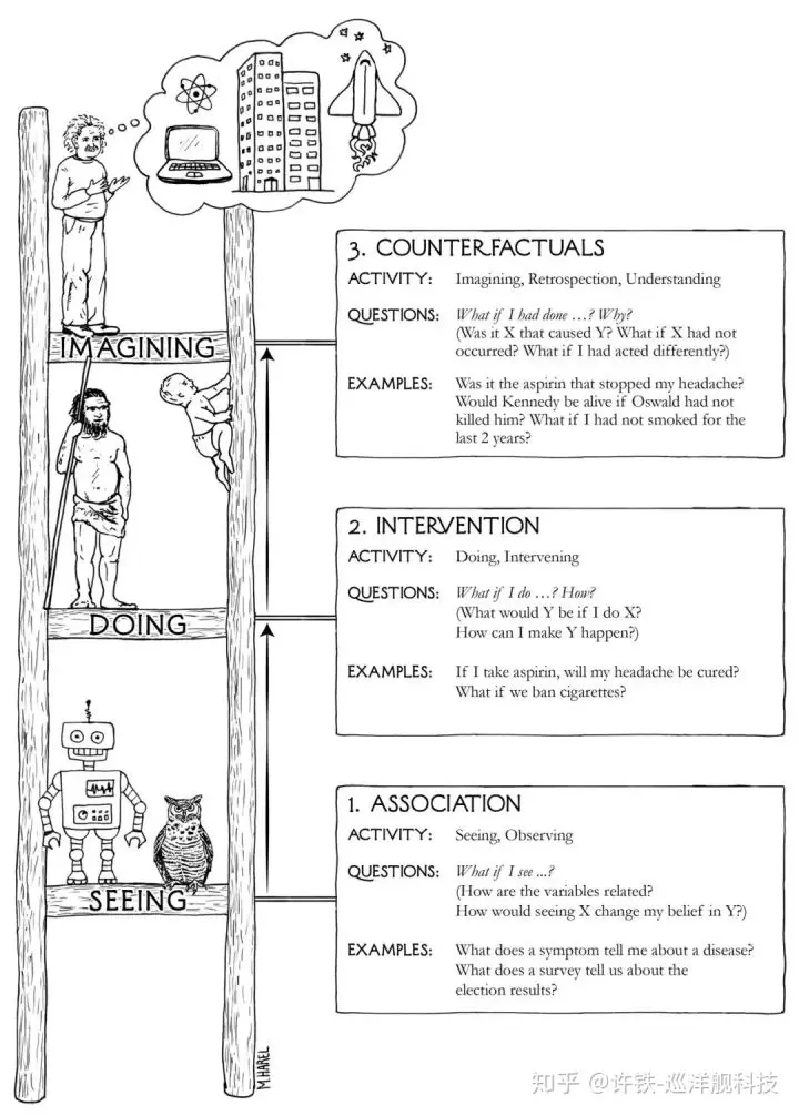 选择“2001太空漫游”的开篇音乐作为配曲,是想让读者回忆起电影中那个经典的蒙太奇,从拿起石头到走入太空,相同的部分初看是使用工具,但从思考问题的方式来看,相同之处是这都意味着要进行反事实的思考,也就是问如果在一个虚拟的情况下,会发生什么?人类简史中说人类合作的基础是人类讲故事的能力,而故事里都是骗人的,那人类的大脑是为什么要进化出讲故事的能力了?这个问题就像人类为什么要具有自由意志这样一种错觉一样,都是我读了《The book of Why》之后想到的一些形而上的思考。为了能说清楚这样的问题,先引用书中的一副图,说说思考问题的三个层次。