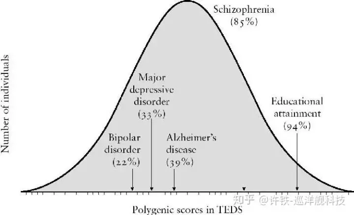 4)基因上的不同和性状的不同不是一对一的关系,而是多对多的。一个基因的差异可以决定多个不同的行为特征,例如可以决定是否有自控能力,是否能延迟满足,在考试中表现的有多好,例如精神分裂相关的基因变异和创造力有关。更重要的是,几乎所有的心理特征以及相关的疾病,都是由数百个上千个基因差异决定的,每个基因差异贡献的程度很低。而且预期还会发现更多这样影响极小的基因差异。