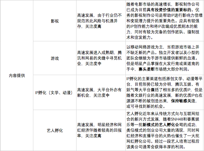 下面我就泛娱乐产业内的各个细分领域做一下逐个分析,让我们来看一下新的机会可能产生在产业内的哪些领域。笔者将泛娱乐产业归为三个大的产业类型:底层技术、内容提供和媒介平台,它们分处于产业的上下游。底层技术包括的细分领域有:文娱产业相关的新技术与智能硬件,内容提供包括的细分领域有:艺人孵化、IP孵化(文学、动漫)、游戏、影视,媒介平台包括的细分领域有:出版发行、内容平台、流量平台、现场娱乐及文化休闲。