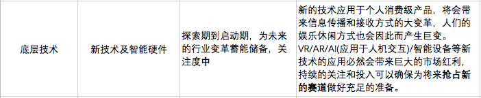 对于每个细分领域下表中都列明了市场所处阶段、创业/投资机会、市场环境分析。