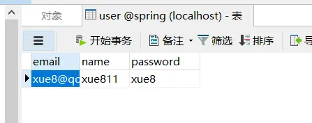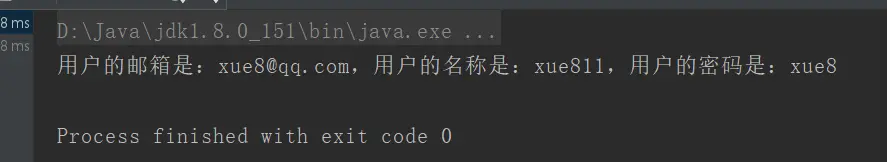 System.out.println("用户的邮箱是:" + user.getEmail() + ",用户的名称是:" + user.getName() + ",用户的密码是:" + user.getPassword());