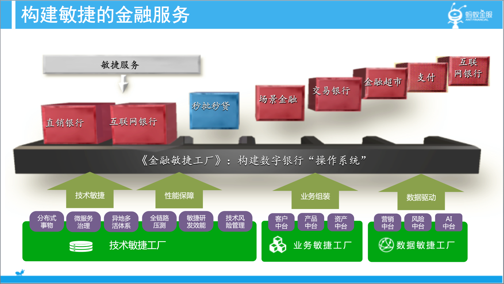 银行业已进入全面数字化时代,数字化转型将从改善客户连接的1.0时代,进入到以敏捷能力为核心的数字化2.0时代。蚂蚁金服认为,打破过去独立分散的系统架构,铸造以分布式平台为支撑的金融敏捷能力中心,将成为银行机构全面数字化转型、提升客户服务能力的重要引擎。