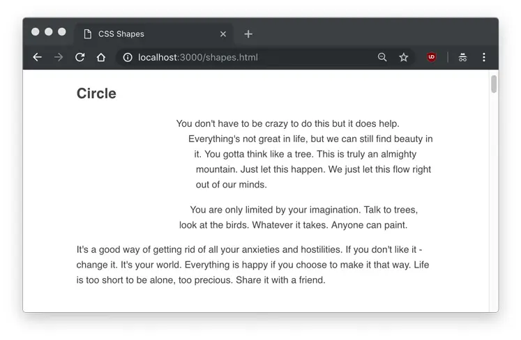We’ll start by creating a circle class on a regular div, and making some paragraphs. (I used Bob Ross quotes as Lorem Ipsum text.)