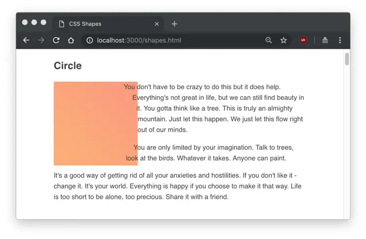 In our circle class, we float the element left, give it an equal height and width, and set the shape-outside to circle().