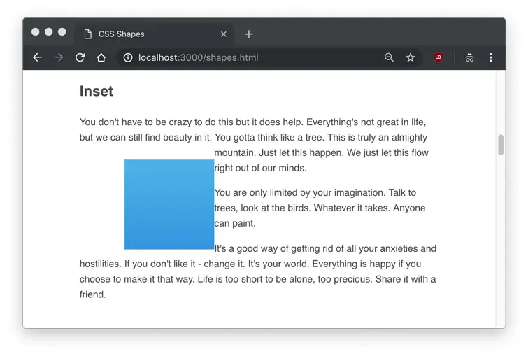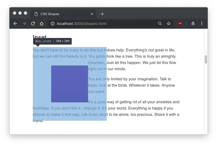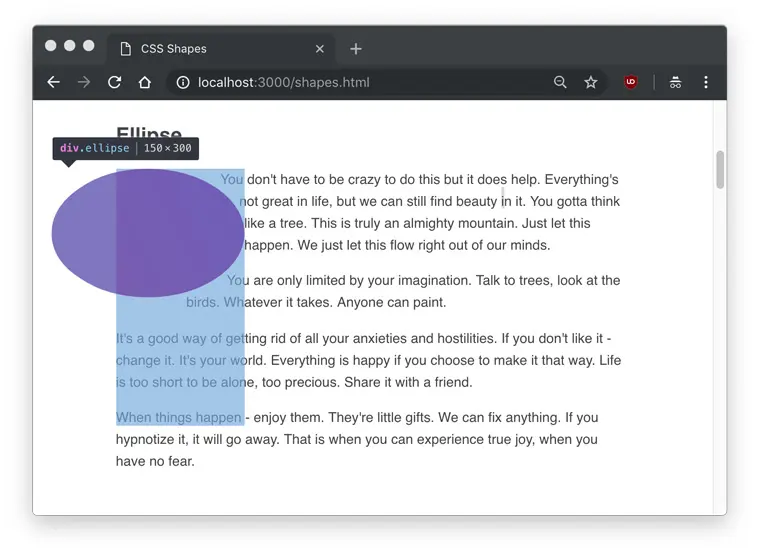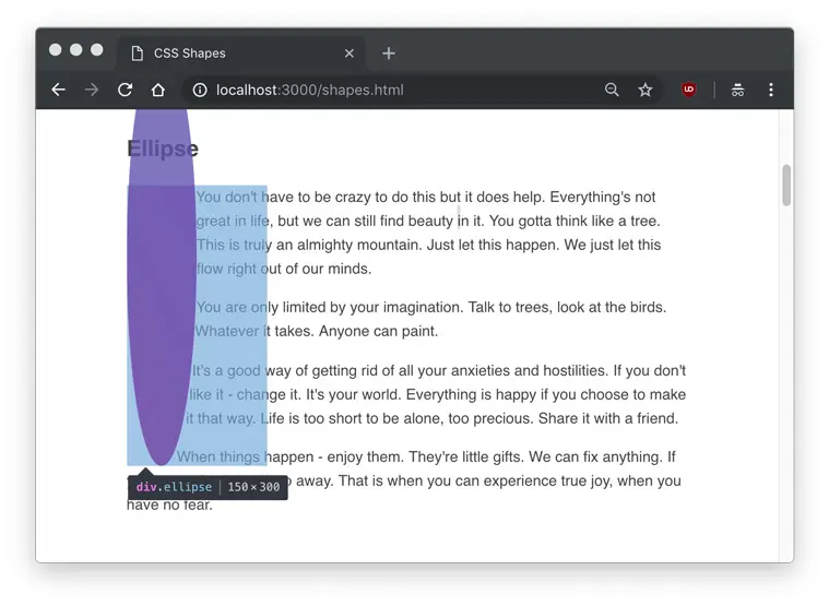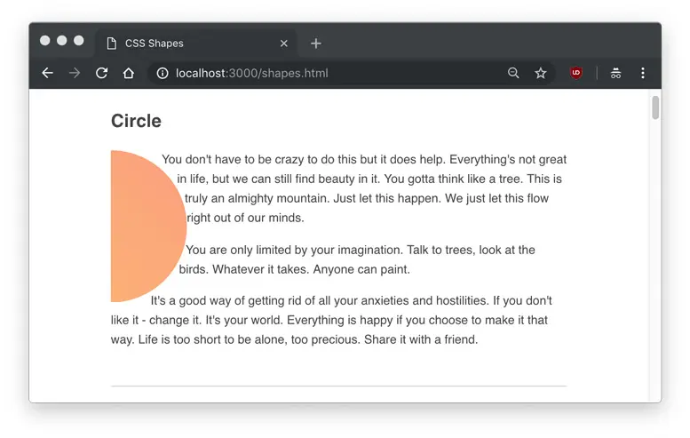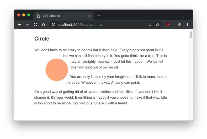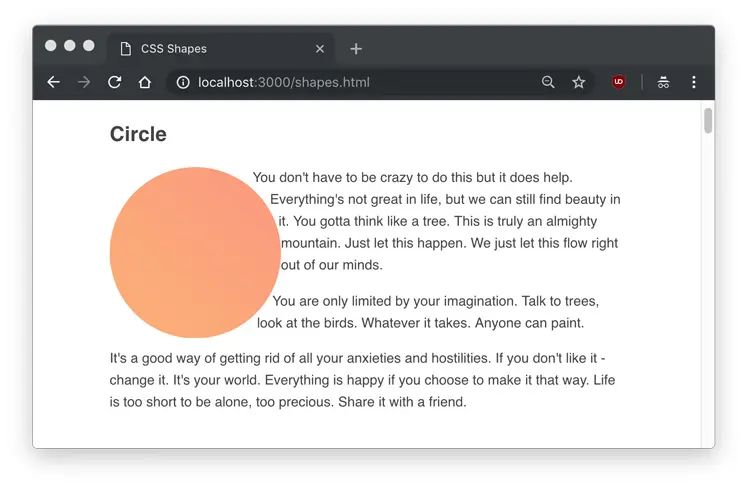 As you can see, the text flows around the circle shape, but we don’t actually see any shape. Hovering over the element in Developer Tools will show us the actual shape that is being set.