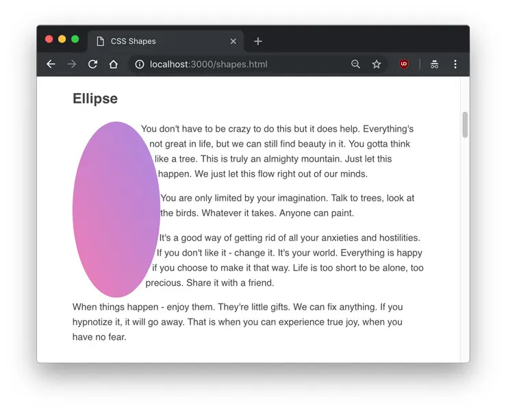 We can clearly see the text flowing around it, yet the element itself doesn’t have a shape. If we want to actually display our shape functions, we’ll have to use the clip-path property. clip-path takes many of the same values as shape-outside, so we can give it the same circle() value.