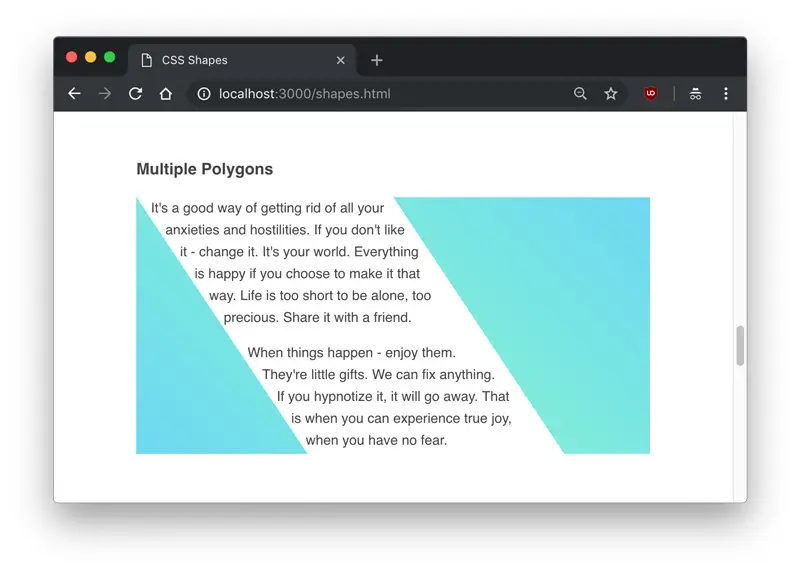 An interesting usage of the polygon() shape function is that text content can flow between two or more shapes. Since the polygon() shape is so flexible and dynamic, this is one of the biggest opportunities to make truly unique,