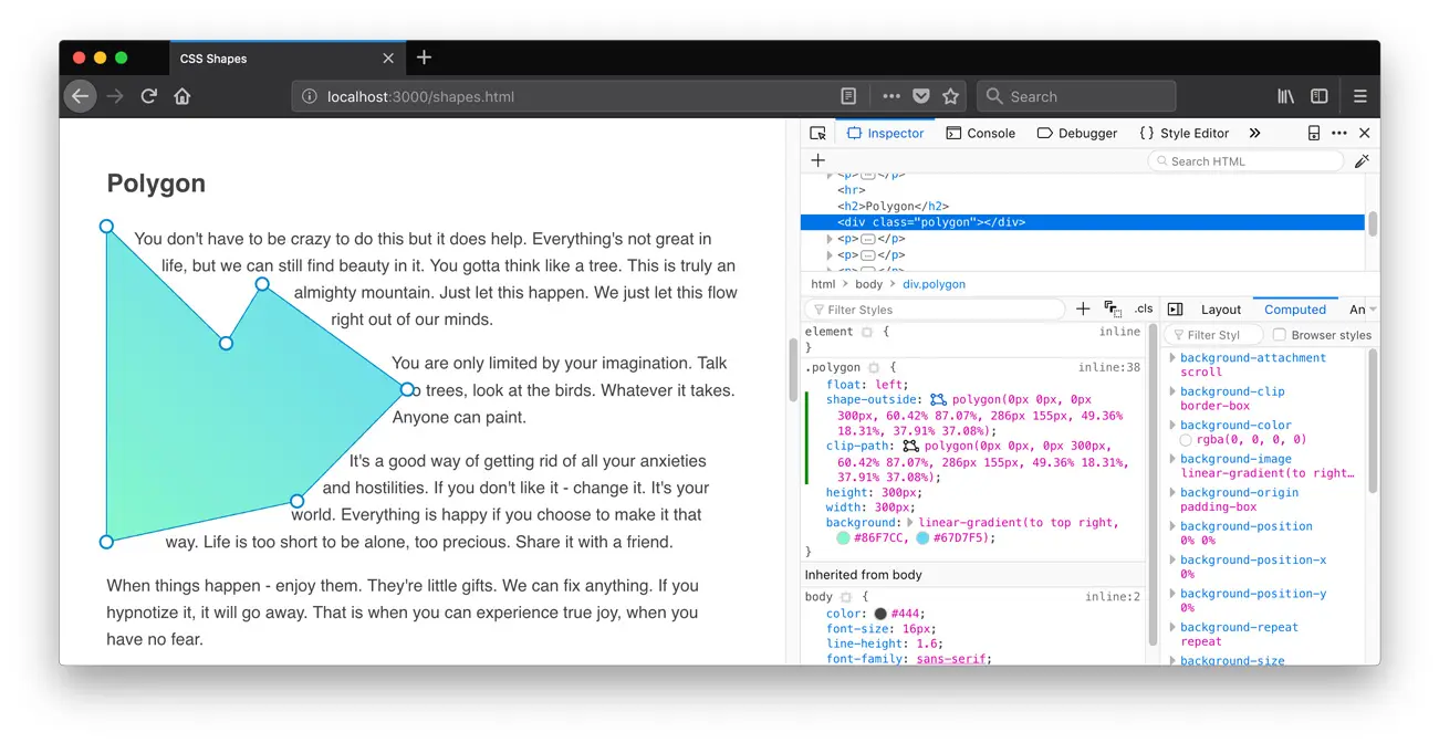 Obviously, it would be very difficult to try to create your own complex shapes manually. Fortunately, there are several tools you can use to create polygons. Firefox has a built in editor for shapes, which you can use by clicking on the polygon shape in the Inspector.