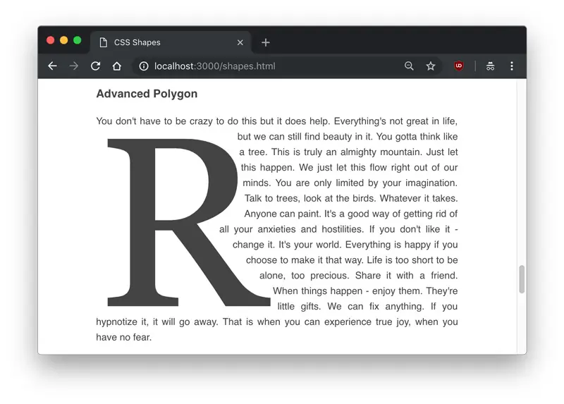 CSS Shapes allow us to define geometric shapes that text can flow around. These shapes can be circles, ellipses, simple or complex polygons, and even images and gradients. A few practical design applications of Shapes might be displaying circular text around a circular avatar, displaying text over the simple part of a full-width background image, and displaying text flowing around drop caps in an article.