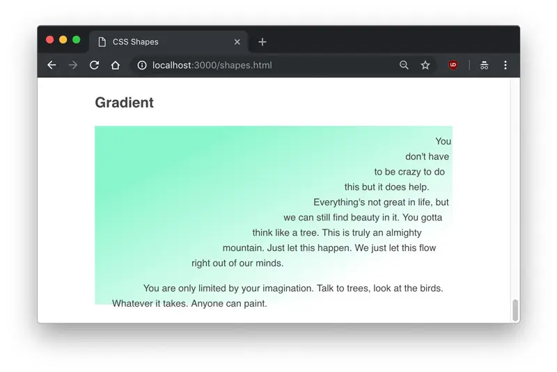 Finally, a gradient can also be used as a shape. Gradients are the same as images, and just like the image example we used above, the text will know to flow around the transparent part.