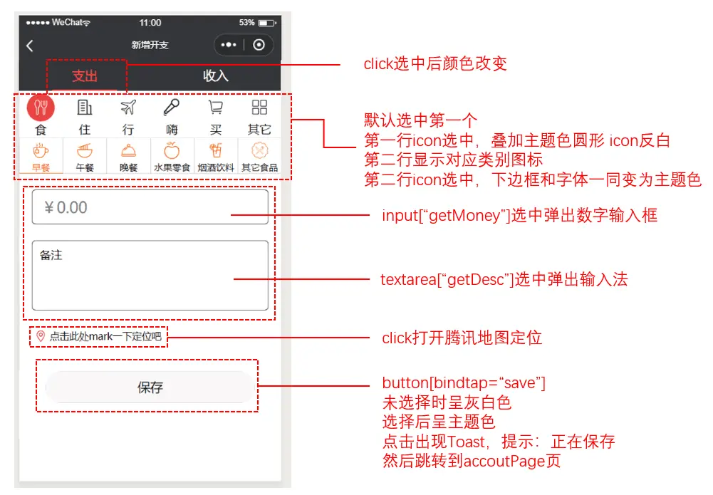 因为收入与支出页面基本类似,所以使用自定义组件封装,可以复用。
