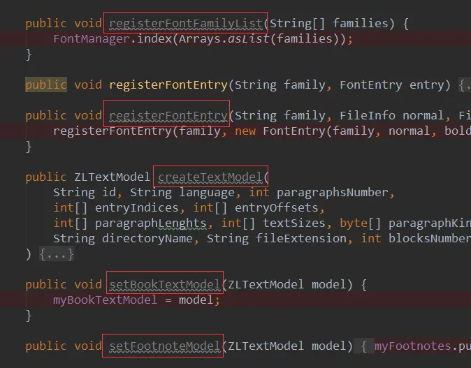 有好多方法都是灰色的,证明在java代码中没有地方调用这些代码,细看一下,这些都是一些set赋值操作,不免想到是否在native进行解析时会调用呢?经过debug后发现,的确在navtive解析电子书时,会调用这些操作赋值许多数据,这也解释了上一篇最后关于BookModel解析前后内容存在差别的原因。这里有三个方法,值得我们去关注一下:
