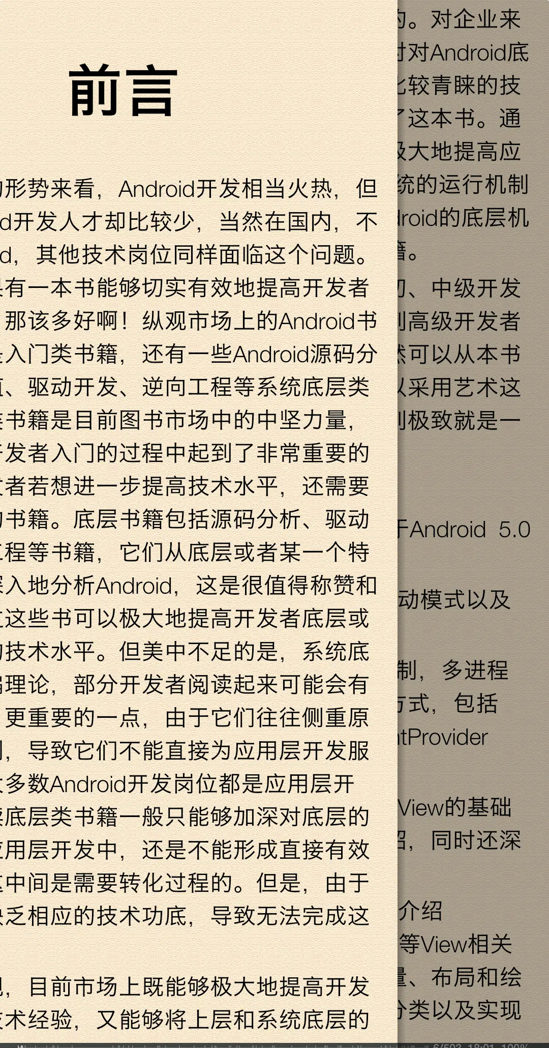 额,手机截图不是很全,但是已经能够看出,最终结果是连个bitmap拼接后铺满了整个控件。而且从对上面整个过程的分析来看:FBReader绘制的时候,针对某一页page,都会去获取该页page对应的bitmap,然后再绘制在cavas上。