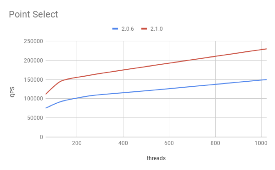我们针对 OLTP 场景中,点查占多数的特点进行了针对性的优化。当通过 Unique Key 或者 Primary Key 进行数据访问时,在优化器和执行引擎中都做了改进,使得语句的执行效率更高,通过 2.1 和 2.0 版本的 Sysbench 对比 可以看到,点查性能提升 50%。