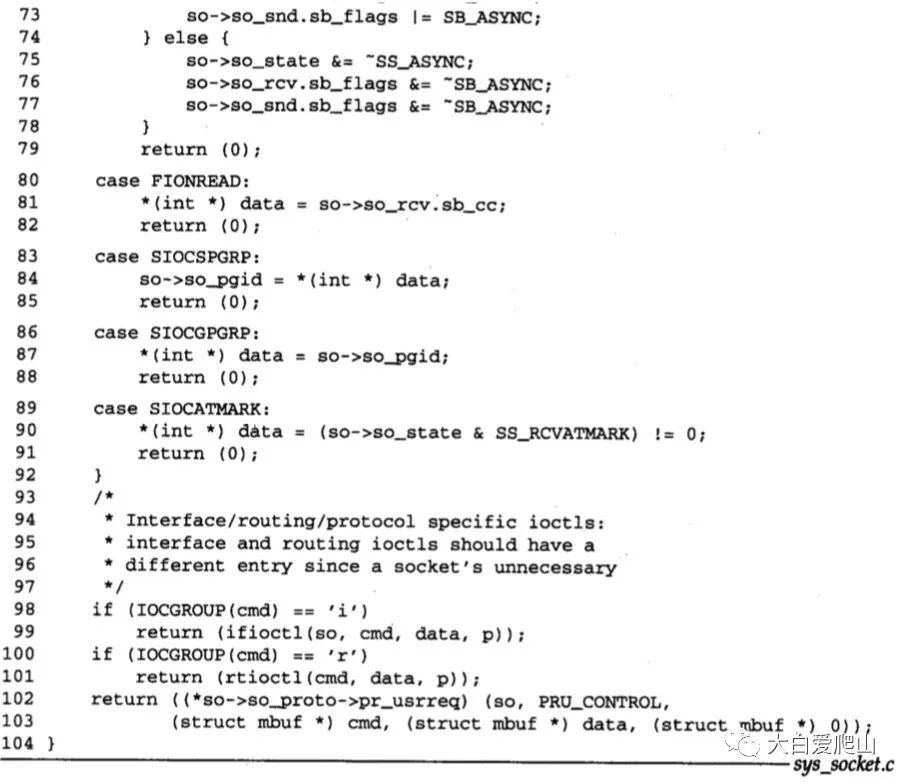 55~68 有几个命令是由soo_ioctl直接处理的。如果*data非空,则FIONBIO打开非阻塞方式,否则关闭非阻塞方式。正于我们了解的,这个标志将影响到accept、connect和close系统调用,也包括其它的读和写系统调用。