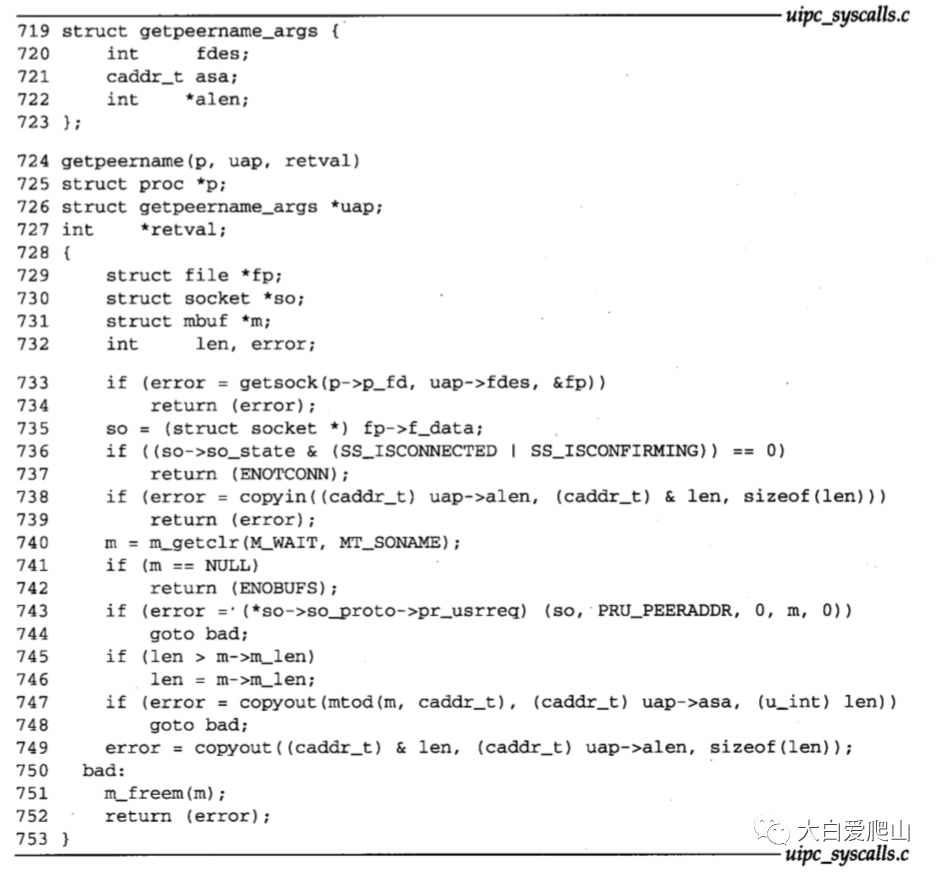 719~753 getsock获取插口对应的file结构,如果插口还没同对方建立连接或连接还同证实(如TP4),则返回ENOTCONN。如果已建立连接,则从进程那里得到缓存的大小,并分配一块mbuf来存储地址。发送PRU_PEERADDR请求给协议层来获取远端地址。将地址和地址的长度从内核中的mbuf中复制到进程提供的缓存中,最后释放mbuf并返回。